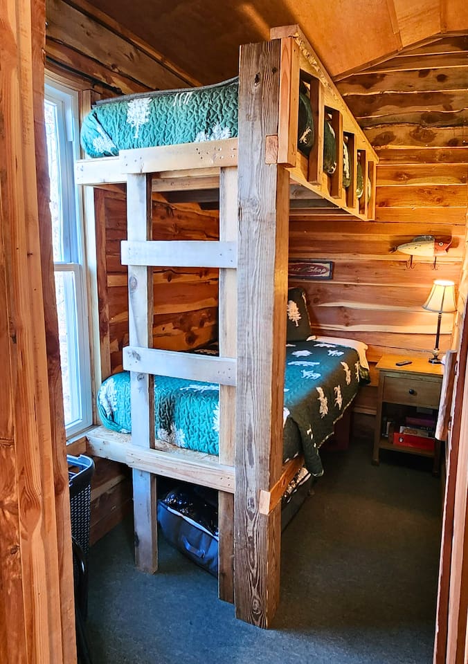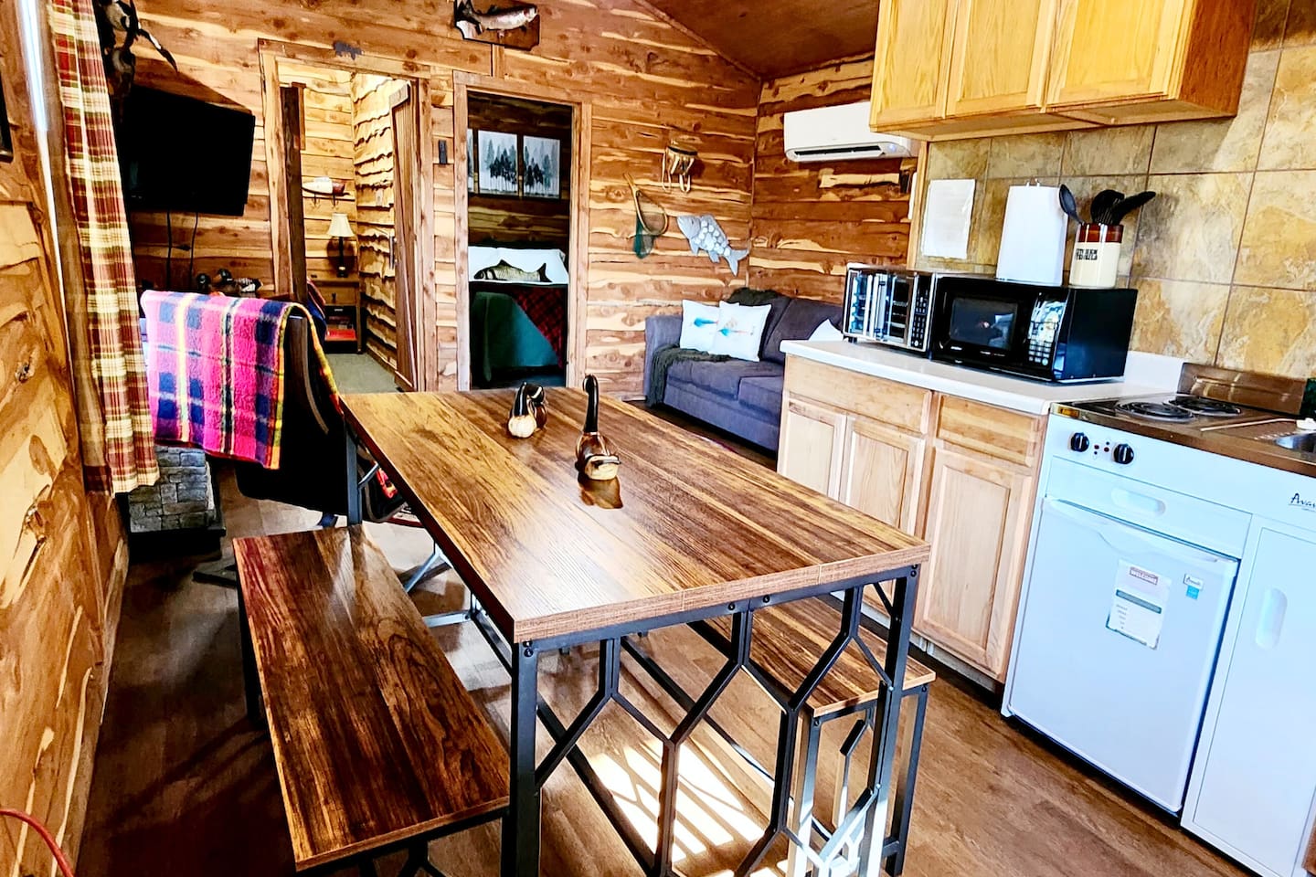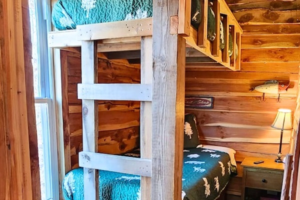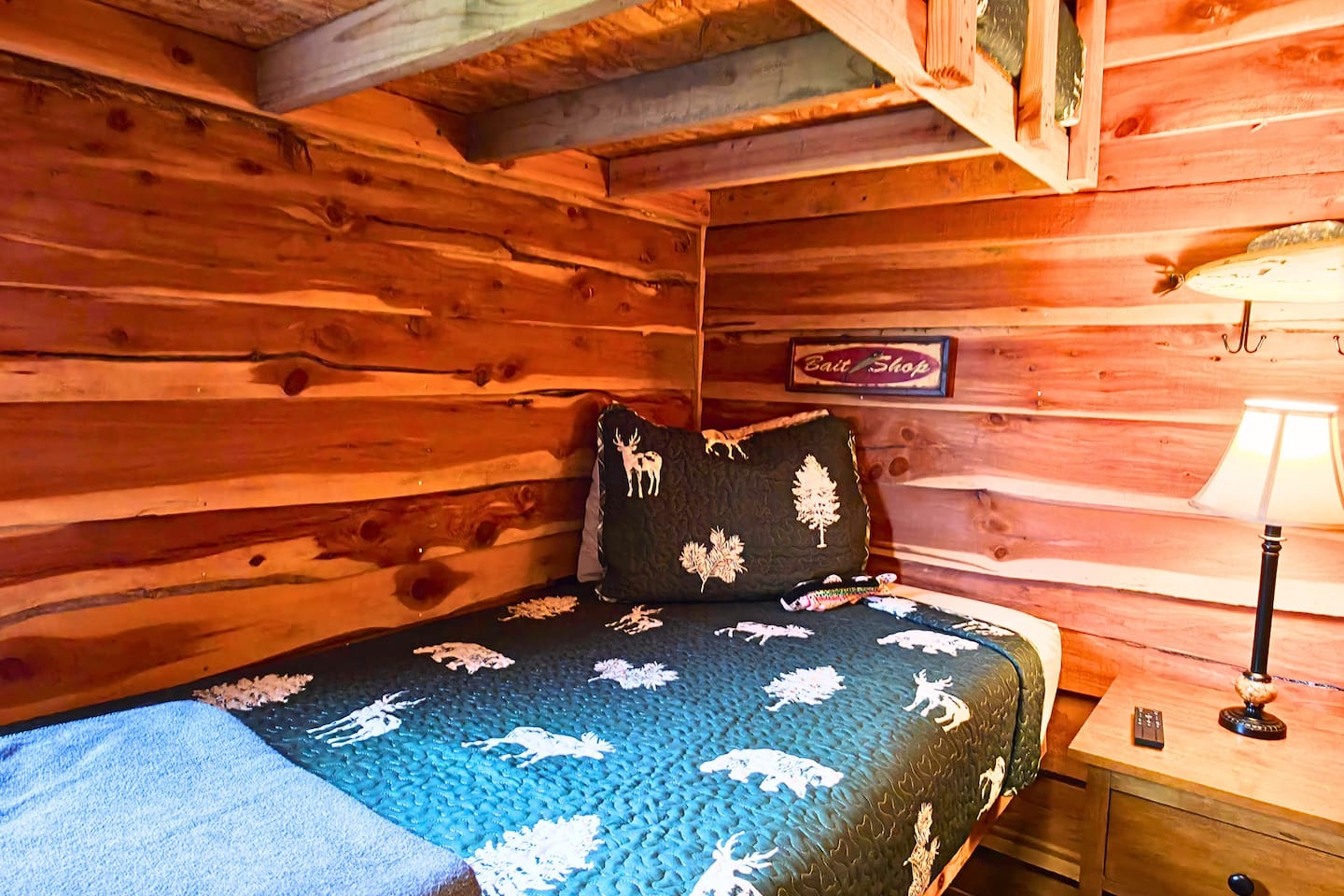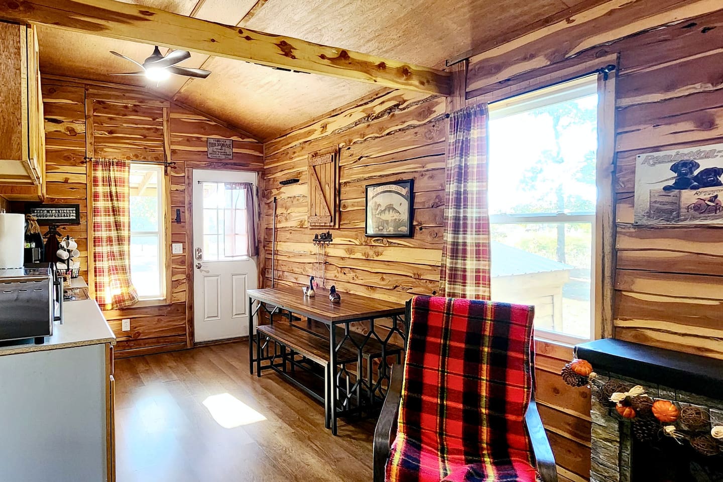 Drift off to sleep in the peaceful cabin bedroom, complete with cozy lighting, ceiling fan, rustic charm, and nature views right outside your window.