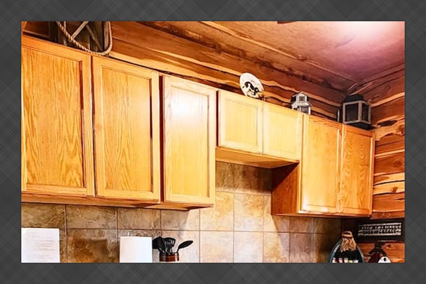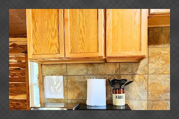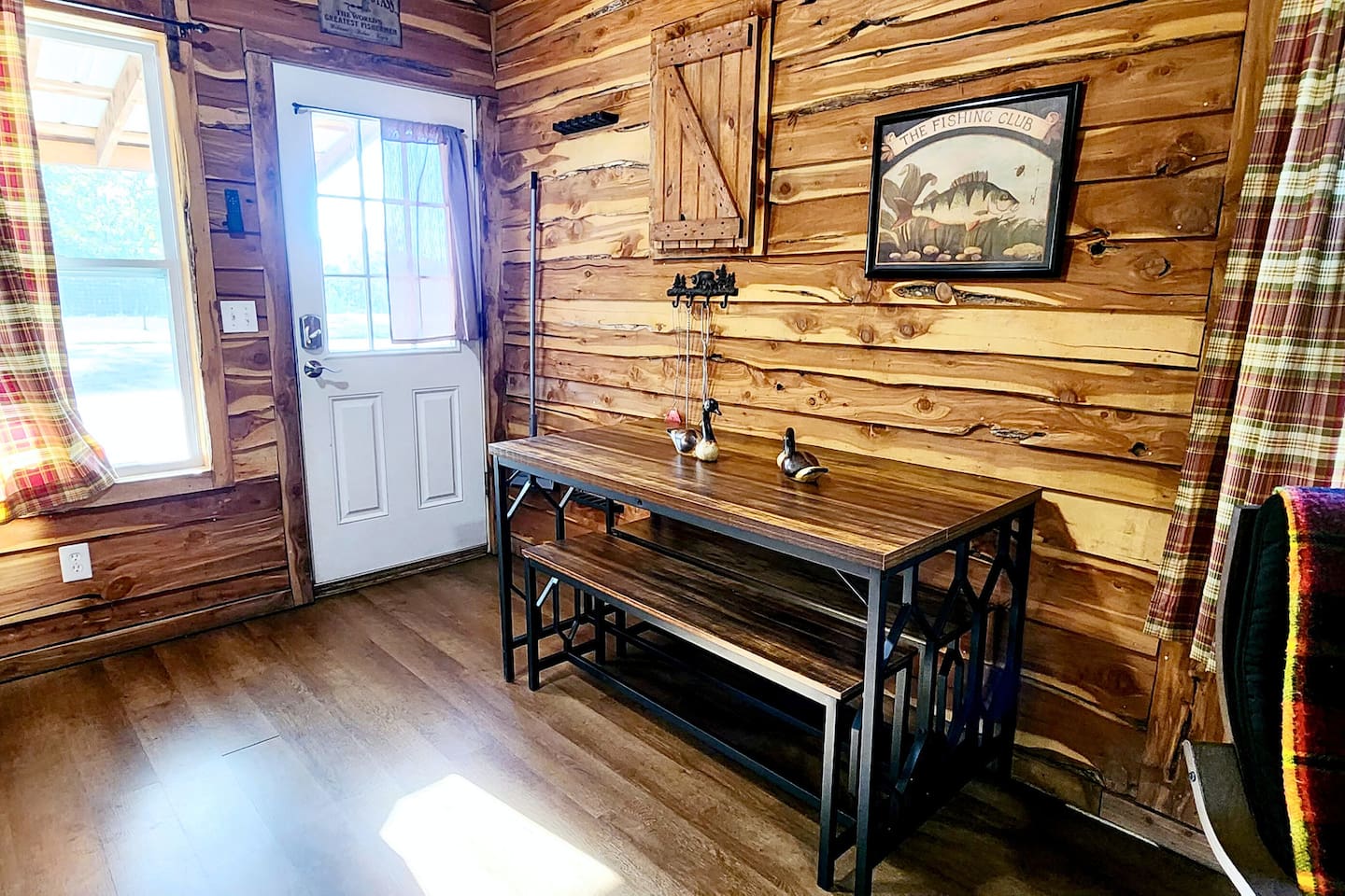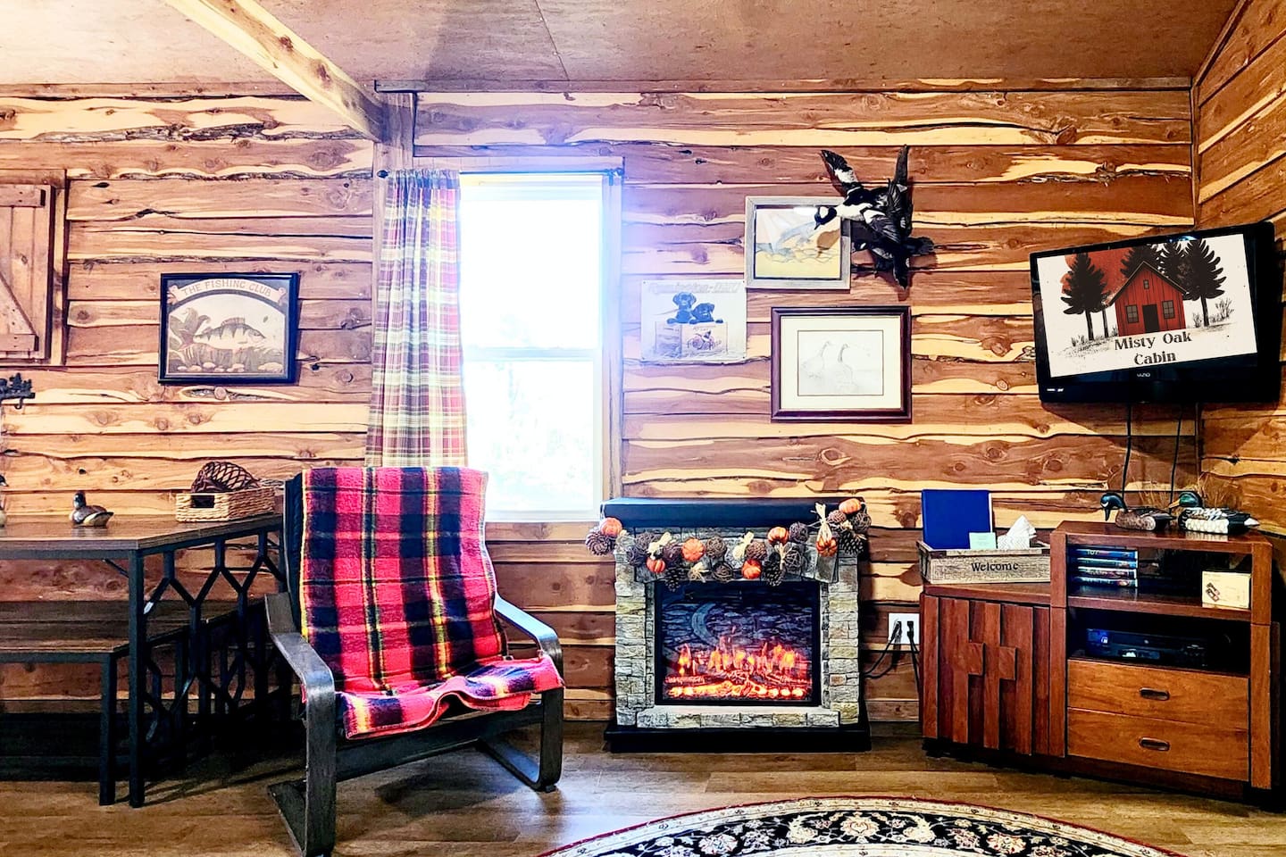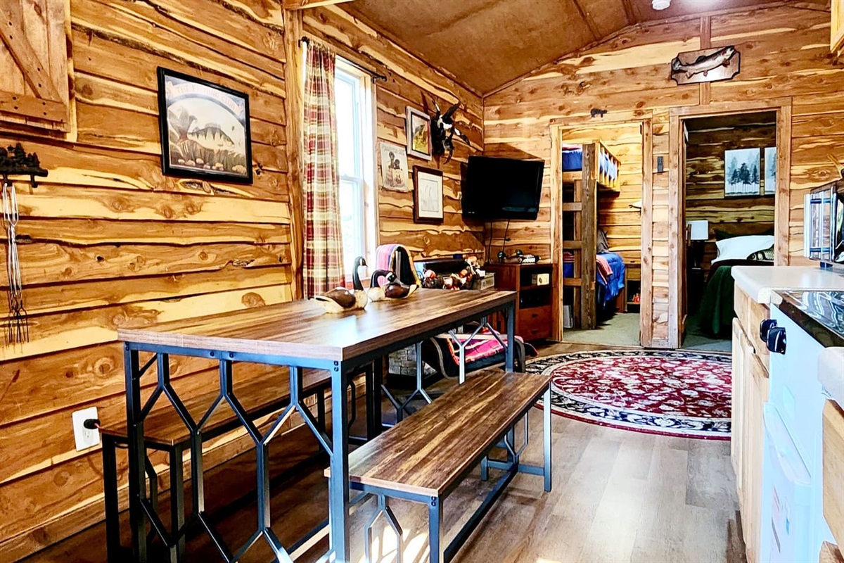 Drift off to sleep in the peaceful cabin bedroom, complete with cozy lighting, ceiling fan, rustic charm, and nature views right outside your window.