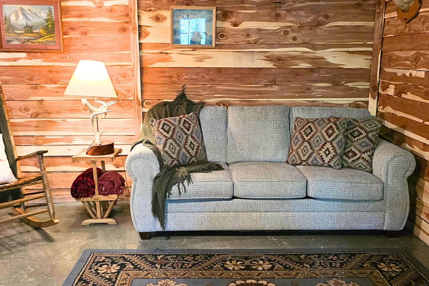 This open concept lodge living room blends rustic charm with comfort featuring a red sofa, cozy chair, rocking recliner, and forest-inspired decor. Layered rugs, wood walls, and soft lighting create a space perfect for relaxing or reconnecting