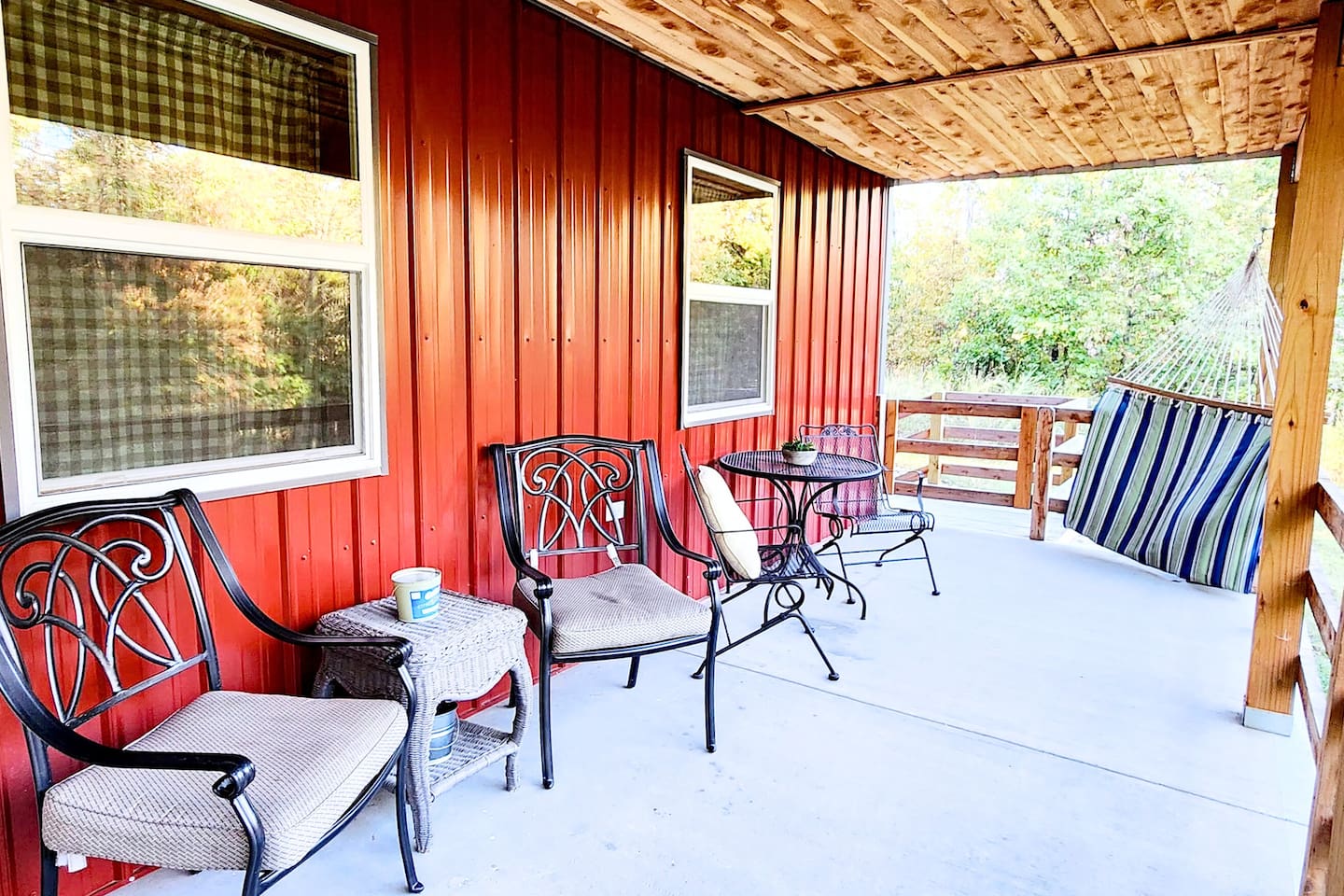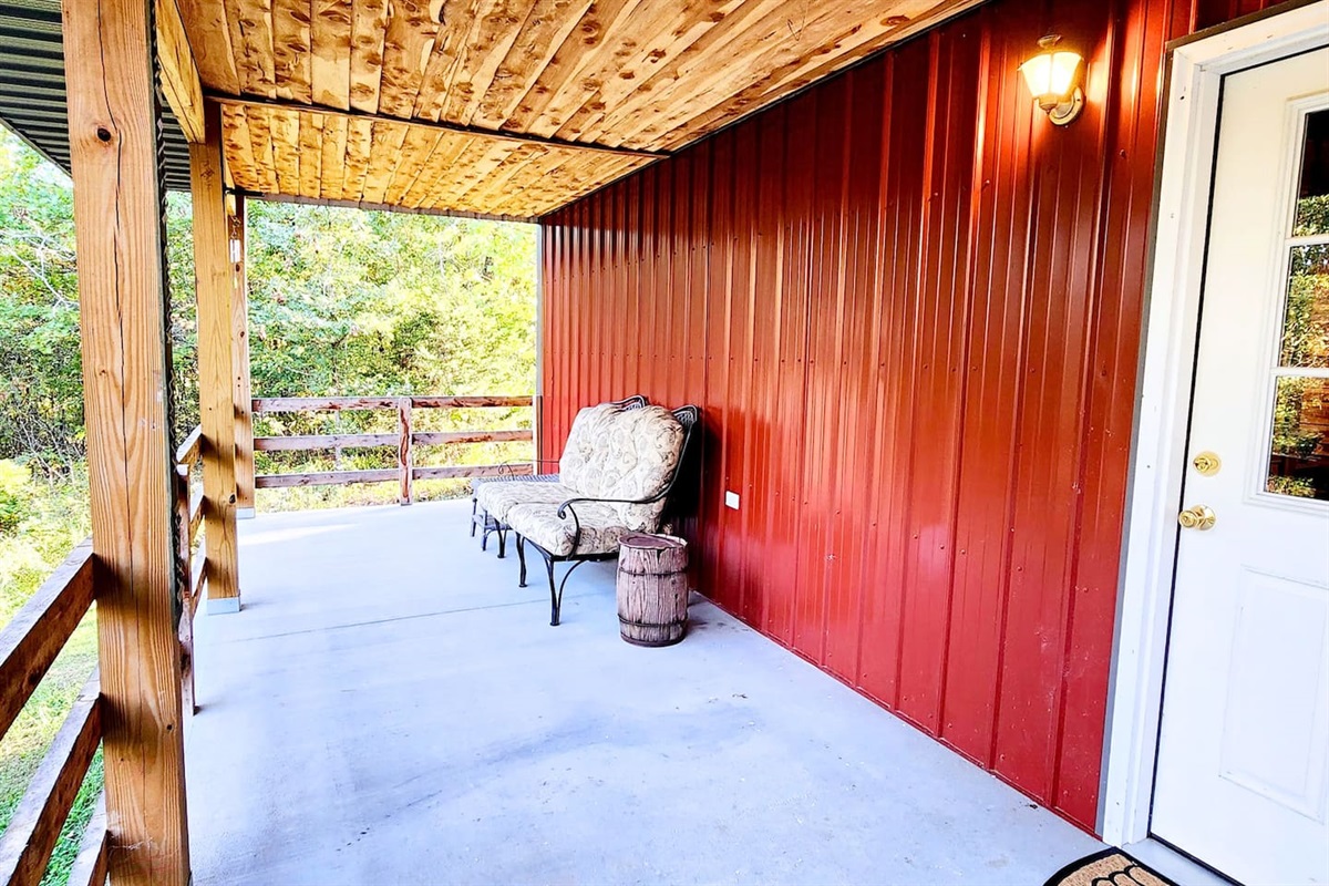 Enjoy your morning coffee or unwind after a day of adventure on this spacious covered porch—perfect for watching wildlife, swapping stories, or savoring the quiet. Plenty of seating invites you to linger longer in the beauty of the woods.